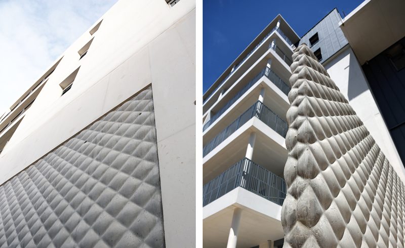 Nous avons donc imaginé deux types de béton, deux aspects et deux réponses, pour reprendre la modénature des bâtiments voisins : en rez-de-chaussée, un béton gris classique matricé, dont le motif géométrique en forme de coussinets rappelle les proportions des murets en pierres grises du quartier, sans chercher à les imiter ; et pour les façades supérieures, un béton très blanc qui joue avec le soleil, la lumière, et reprend la teinte de la pierre calcaire omniprésente.