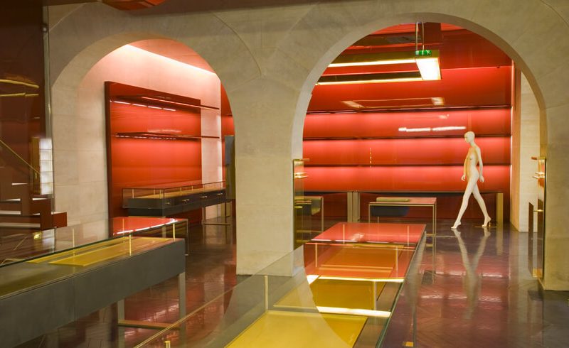 En accord avec le directeur artistique Stefano Pilati, les architectes jouent la carte du “décalé” en déclinant la couleur fétiche et iconique qui habille le flacon du parfum Opium. Ils la matérialisent sur un support de laque réfléchissante.