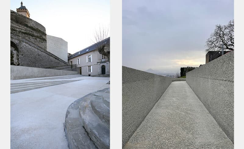 Qu’il s’agisse des voiles verticaux des ascenseurs, des revêtements de sol du parvis ou de l’intérieur du musée, nous sommes partis d’une formule identique, que nous avons adaptée selon les configurations : il lui arrive donc de contenir des pierres, d’être sablé, bouchardé, poncé, ou simplement décoffré. Pour nous, le projet du château de Foix a été l’occasion d’apprendre et d’expérimenter les différents savoir-faire et mises en œuvre du béton.