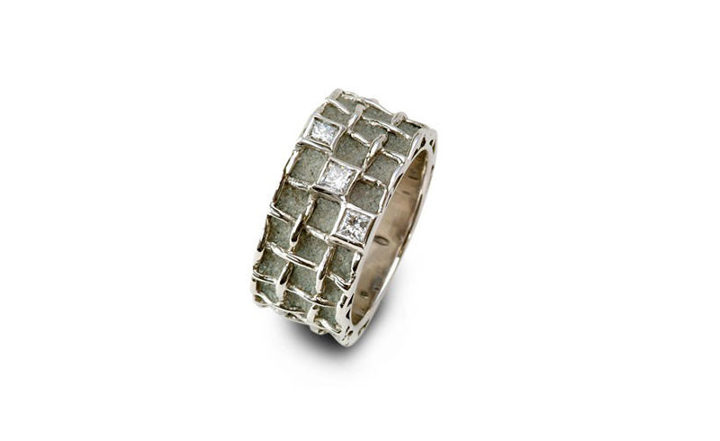 L’idée d’utiliser le béton pour créer des bijoux m’est venue à l’occasion d’un séminaire organisé par De Beers pour définir les tendances. Notre recherche portait sur les nouveaux matériaux. Je regardais un mur en face de moi et l’idée d’utiliser le béton m’est apparue comme une évidence. Mélanger du béton, de l’or et des diamants, c’était vraiment inédit ! J’ai imaginé créer un bijou comme on construit un mur en béton armé, en coulant du béton autour d’une armature métallique.