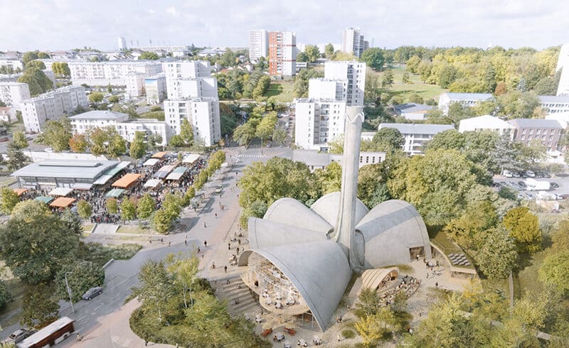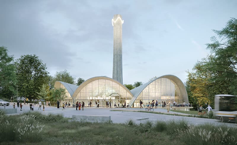 Luke Gates : La Chaufferie des Tarterêts a été construite en 1970 pour alimenter en chaleur les grands ensembles du quartier, à Corbeil-Essonnes. Elle chauffait près de 10 000 habitants, d’abord au fioul, puis au gaz. Elle a cessé son activité au début des années 2010. Le bâtiment est signé par les architectes Jean-Pierre Jouve et Roland Dubrulle, avec l’ingénieur René Sarger. Autour d’une cheminée de 36 mètres, cinq voiles minces en béton de 11 centimètres d’épaisseur forment des coques de 26 mètres de portée, une performance remarquable à l’époque. Comme beaucoup de chaufferies des grands ensembles, elle était pensée comme un repère central, presque une vitrine technique. Celle-ci se distingue par la finesse de ses voiles et la qualité de son ingénierie. Inscrite aux Monuments historiques en 2016, elle fait aujourd’hui l’objet d’un projet de transformation porté par la Ville dans le cadre de la consultation internationale Quartiers de demain, qui encourage la réhabilitation de l’existant plutôt que sa démolition.