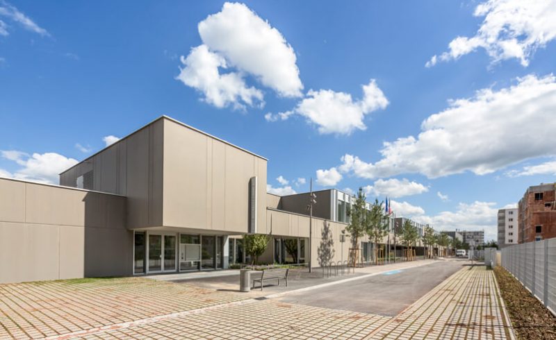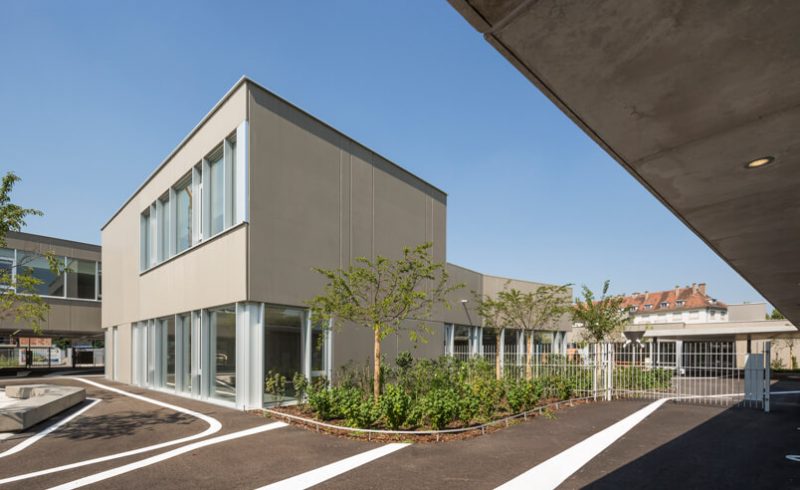 À Lingolsheim, au sud-ouest de Strasbourg (67), un écoquartier a progressivement émergé de terre, sur l’ancienne friche industrielle des Tanneries. Sur l’une de ses parcelles, aussi longue qu’étroite (250 m x 50 m) et bordée par une voie ferrée, il accueille depuis un an trois programmes sous un même toit : le groupe scolaire Simone Veil, le gymnase Colette Besson, ainsi qu’un institut médico-éducatif. Parmi les attentes de la Ville sur ce projet, certaines étaient impérieuses : créer un cœur de quartier, réaliser les études et la construction en trois ans (2014-2017) et, conformément au projet municipal École 2020, mettre à la disposition des enfants une école moderne, parée pour la pédagogie de demain.
