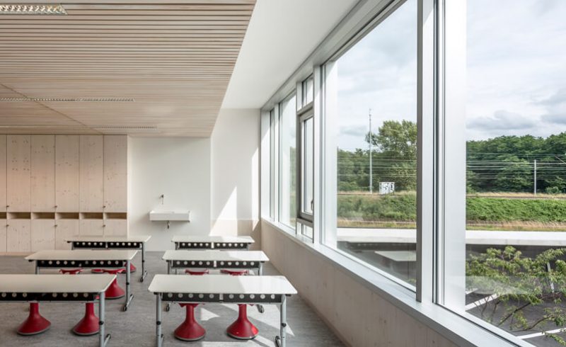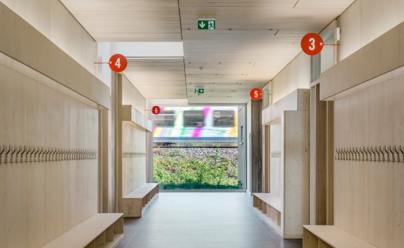 Pour inscrire le programme dans son contexte urbain, les architectes déclinent le vocabulaire ferroviaire avec une économie de formes : « Un auvent de la cour d’école a été dessiné comme un quai de gare, les circulations intérieures ont été imaginées comme des galeries cadrant sur les rails, et la distribution des vestiaires du gymnase a été pensée comme un wagon de train rapide avec son long vitrage filant », explique Jan Richter.