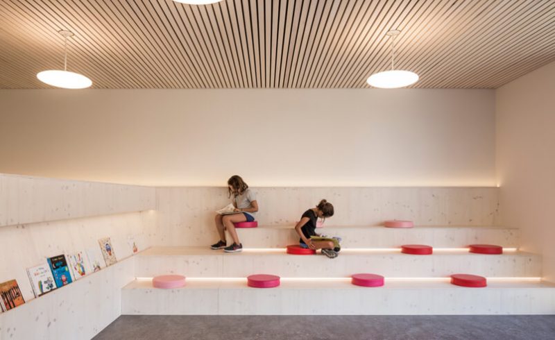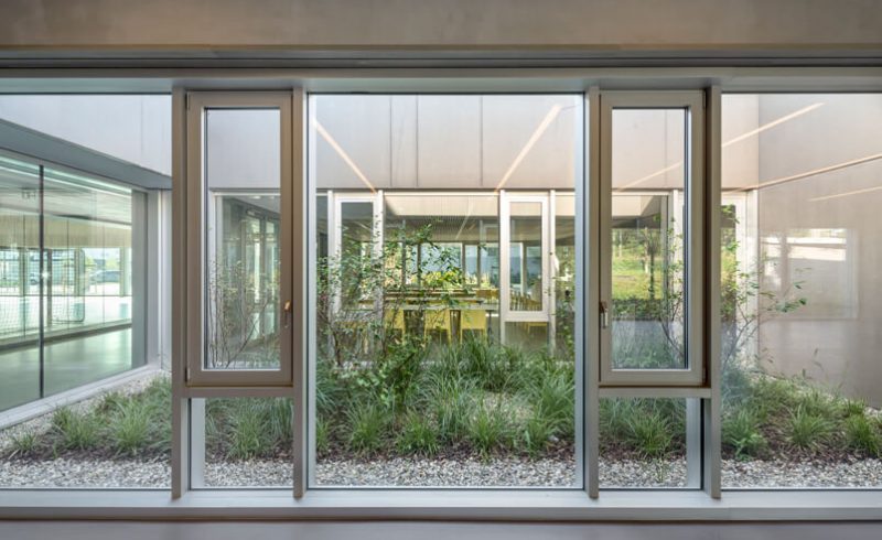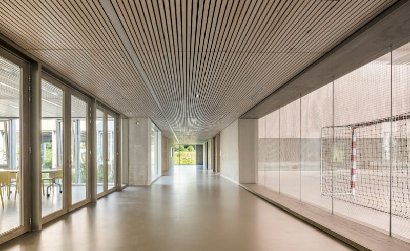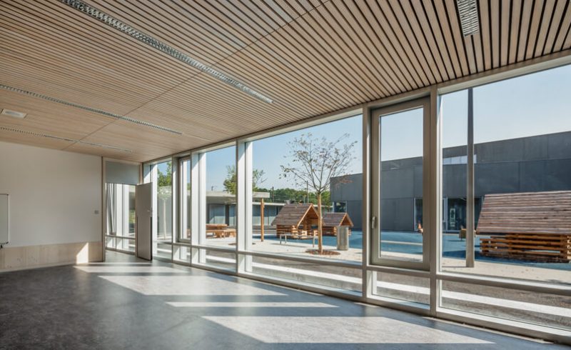 Le tout est dénué d’artifices – un fait assez rare dans les groupes scolaires, où les architectes se sentent souvent obligés d’imposer un décor ludique et pédagogique -, mais l’organisation spatiale est ponctuée de perspectives visuelles qui favorisent les liaisons et les rapports avec le monde extérieur tout en créant des espaces agréables, fonctionnels et naturellement éclairés… L’ensemble sert le fonctionnement global et génère un sentiment d’harmonie et de paix bienvenues dans ce type de programme.