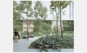 La surépaisseur de cette nouvelle façade grâce aux bow-windows a aussi permis de gagner de la surface dans les étages, ce qui a ouvert la possibilité de démolir le socle qui abritait une galerie commerciale pour en faire un espace végétalisé doté d’un pavillon de services ouvert au public. Ce jardin, dans la continuité des bords de Seine, fera office d’îlot de fraîcheur en été.
