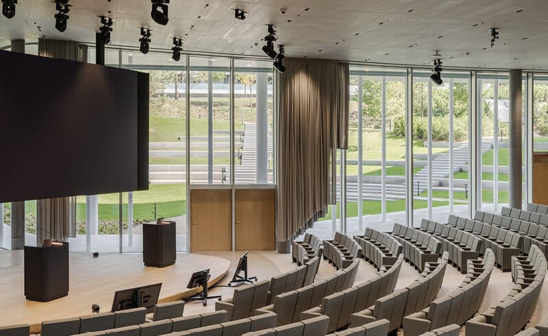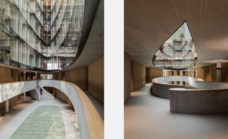 À l’intérieur, les dalles se transforment en rampes ou en escaliers, permettant des transitions fluides entre les niveaux. Cette topographie est particulièrement visible dans et autour du grand auditorium, où les gradins courbés se prolongent à l’extérieur et constituent un théâtre en plein air. Véritable prouesse, cet espace de conférences est doté, d’un côté, d’une paroi verticale incurvée évoquant une vague de béton brut et, de l’autre, d’une baie vitrée sur toute sa hauteur. Autre masterpiece de 1Roof : son vaste atrium central, qui apporte de la lumière naturelle jusqu’au cœur du bâtiment.