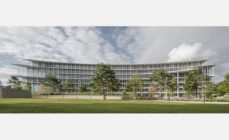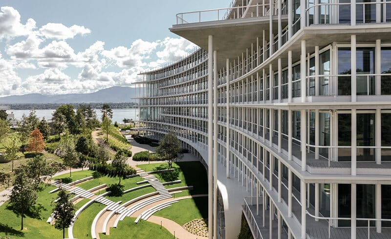 « Le nouveau siège de Lombard Odier se distingue par ses dimensions inhabituelles et sa conception originale. De l’extérieur, le bâtiment évoque un ‘mille-feuilles’ avec ses dalles horizontales aux formes irrégulières ; l’ensemble semble flotter au milieu d’une forêt de piliers blancs. De l’intérieur, les façades vitrées offrent des vues sur le lac, parfois jusqu’au Mont Blanc. Cette architecture s’ouvre vers l’extérieur – le paysage, la communauté, les clients – mais aussi vers l’intérieur, réunissant tous les employés sous un même toit. »