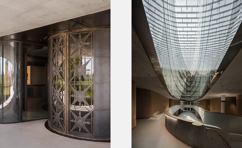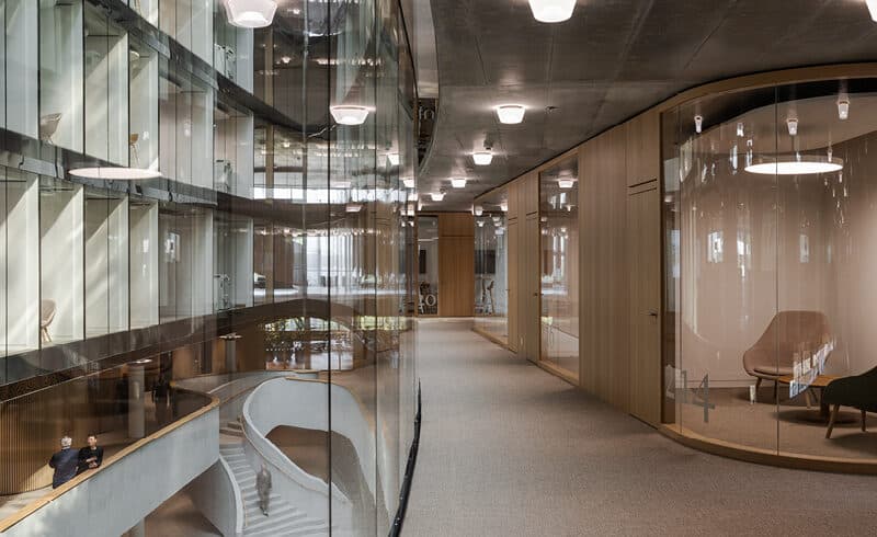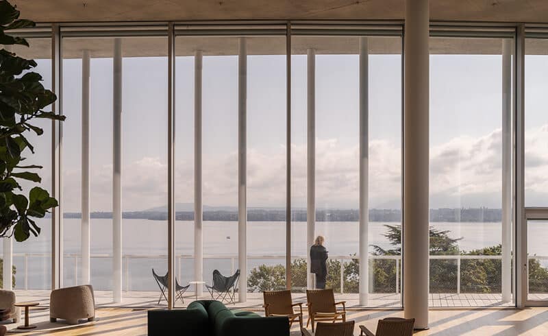 Situé à Bellevue, 1Roof, le nouveau siège social de Lombard Odier, met l’accent sur la transparence. Avec ses façades entièrement vitrées, le bâtiment maximise la perception du Grand Paysage genevois : le lac Léman, les montagnes, la verdure alentour… Si la banque a sélectionné en 2017 le projet d’Herzog & de Meuron, c’est en raison de « son architecture ultra-contemporaine, alliant ouverture sur l’environnement, élégance et innovation ». « Après les bâtiments minéraux, hermétiques du centre-ville, nous avons voulu un espace transparent, ouvert sur la nature, afin de rompre avec l’image de la banque coffre-fort (…)», explique Pierre de Meuron dans La Tribune de Genève.
