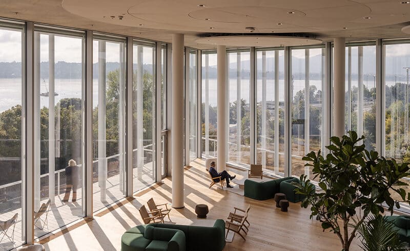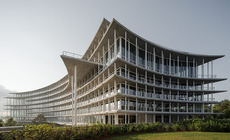Lombard Odier, la plus ancienne banque privée de Genève, a inauguré son nouveau siège social en septembre 2025. Accueillant plus de 2 000 collaborateurs auparavant répartis sur cinq sites, le bâtiment a été conçu par Herzog & de Meuron. Ses fines dalles courbes en porte-à-faux offrent une allure aérienne à ce majestueux paquebot, tout en contribuant à sa performance énergétique.
