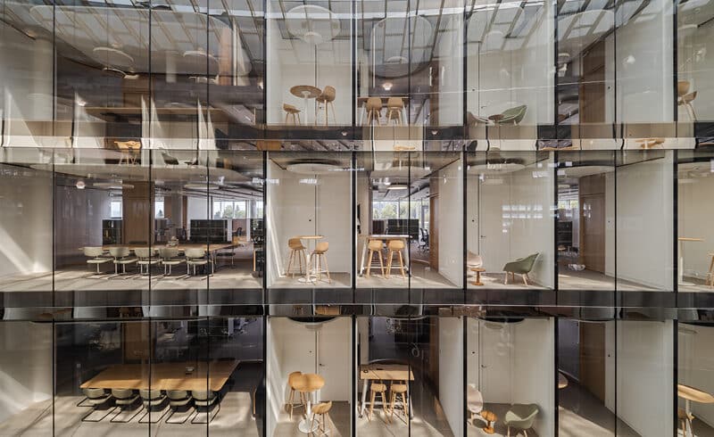 Dans ce cadre de travail idéal, avec abondance de lumière naturelle à tous les étages et vues panoramiques sur tous les côtés, les différents espaces offrent des zones propices à la concentration et d’autres, à la collaboration. Pour les repas, les salariés disposent de plusieurs options, notamment une cafétéria avec une grande terrasse au sixième étage. Un espace fitness est aussi à leur disposition.