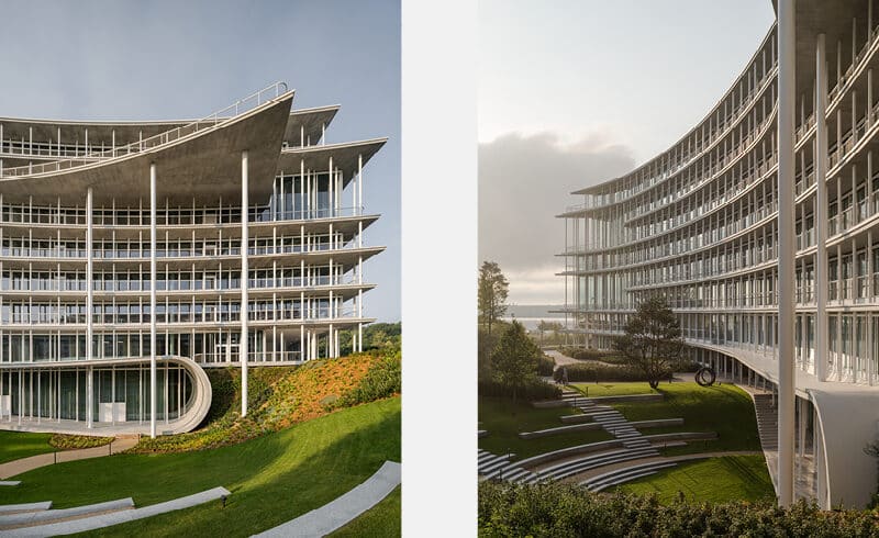 À l’extérieur, celles-ci constituent des coursives assurant la protection solaire des façades vitrées, créant des espaces couverts tout autour de la structure et cadrant les vues sur le paysage : le béton n’est pas seulement structurel, il organise l’éclairage, l’ombrage et la lecture des espaces. Partiellement décalées les unes par rapport aux autres, ces coursives diffèrent selon leur orientation et les fonctions adjacentes. Des pilliers métalliques blancs et élancés les soutiennent et se fondent avec d’autres éléments verticaux tels que les descentes d’eaux pluviales.