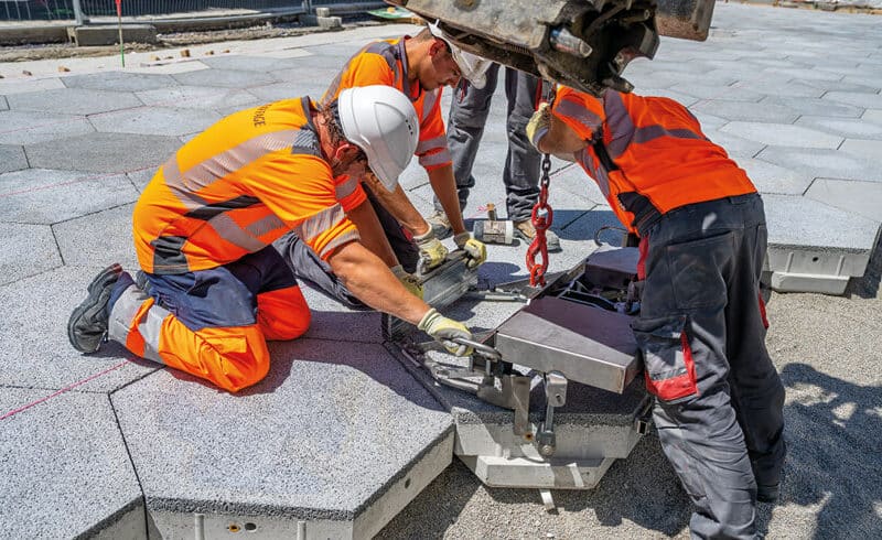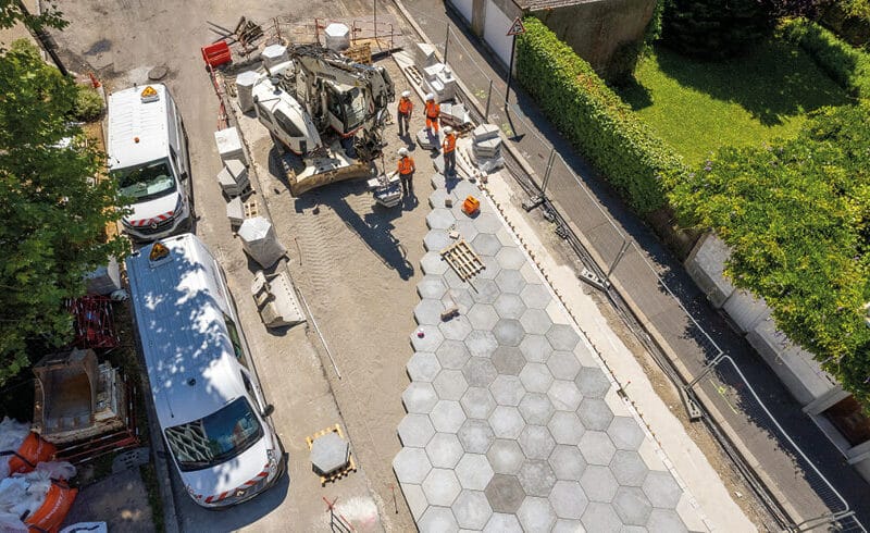 Une chaussée urbaine facilement démontable pour avoir accès aux réseaux et rapidement remontable pour restaurer la circulation, c’est ce qui a été réalisé à Nantes, entre la gare et le stade Marcel-Saupin. Démarré en 2018, le projet I-STREET, mené en partenariat par l’Université Gustave Eiffel, Eiffage Route et Alkern, s’est concrétisé, en 2022, via la réalisation pour Nantes Métropole d’un démonstrateur de chaussée urbaine démontable à couche de surface fonctionnalisée (CUD-SF), constituée de dalles hexagonales bicouches en béton. « La couche de surface est réalisée en béton drainant qui laisse l’eau s’infiltrer, tandis que le corps des dalles, en béton auto-plaçant, est constitué de granulats locaux en partie recyclés », explique Annabelle Brizou, directrice R&D d’Alkern.