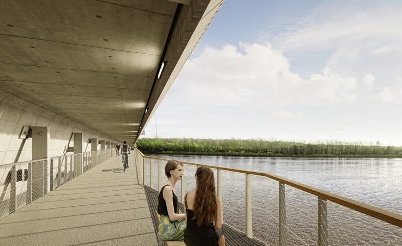 Lauréat du concours de conception-construction, le groupement Aevia / MOG Architectes / Setec a proposé à l’Etat, qui est maître d’ouvrage, une solution audacieuse. « Le premier scénario possible était de situer la passerelle à la hauteur du tablier. Le deuxième, qui a été retenu, était de l’insérer à 3 mètres en-dessous. Ce design est plus élégant, il dessine une ligne continue calée à la tangente des arcades, presque invisible dans la lecture globale de l’ouvrage. Et grâce à cette situation sous l’encorbellement, au plus près du caisson longitudinal, colonne vertébrale du pont, la passerelle profite d’une protection naturelle contre les intempéries, le vent et les nuisances routières. Elle offre en outre à ses usagers des belvédères permettant de contempler, en face, l’île d’Arcins », explique Julien Mogan, architecte associé en charge du projet.